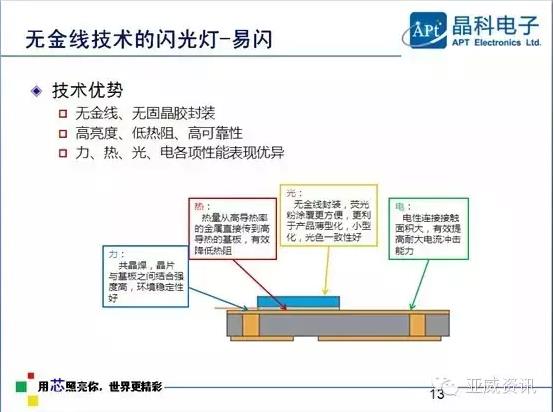 据区总介绍,无金线技术的闪光灯——易闪,有以下几个技术优势:1、无金线、无固晶胶封装;2、高亮度、低热阻、高可靠性;3、力、热、光、电各项性能表现优异。